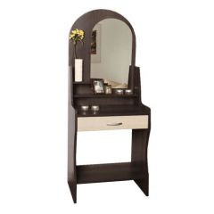 Туалетный стол «Надежда-М07» – изящный предмет мебели, предназначенный для хранения различных средств по уходу за внешностью. Устойчивость конструкции обеспечивают две боковые панели фигурной формы. Силуэт зеркала повторяет форму задней стенки изделия. Несколько открытых полочек позволяют размещать изящные предметы. Для хранения мелких вещей стол оснащён выдвижным ящиком, расположенным под рабочей поверхностью. Свободное пространство в нижней части конструкции и ширина 600 мм позволяют человеку комфортно располагаться перед зеркалом.